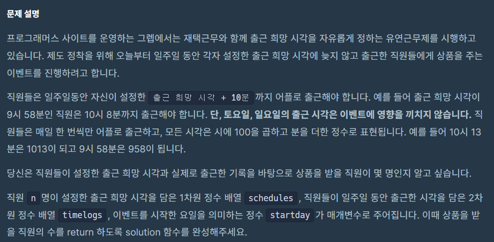 프로그래머스 LV1 - 유연근무제 본문